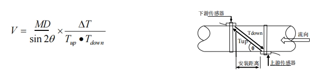 當超聲波束在液體中傳播時,液體的流動將使傳播時間產(chǎn)生微小變化,其傳播時間的變化正比于液體的流速。零流量時,兩個傳感器發(fā)射和接收聲波所雲(yún)的時間完全相同(可實際測量零流量的技術(shù)),液體流動時,逆流方向的聲波傳輸時間大于順流方向的聲波傳輸時間。其關(guān)系符合下面表達式: